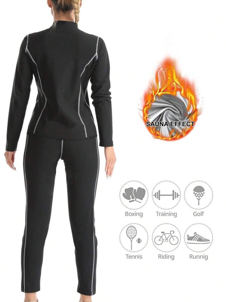 بدلة ساونا للتخسيس باللون الأسود تساعد على زيادة التعرق أثناء التمارين وحرق الدهون بشكل أسرع مع تصميم مطاطي مرن يضمن الراحة أثناء الحركة ويدعم أداء التمارين الرياضية اليومية.